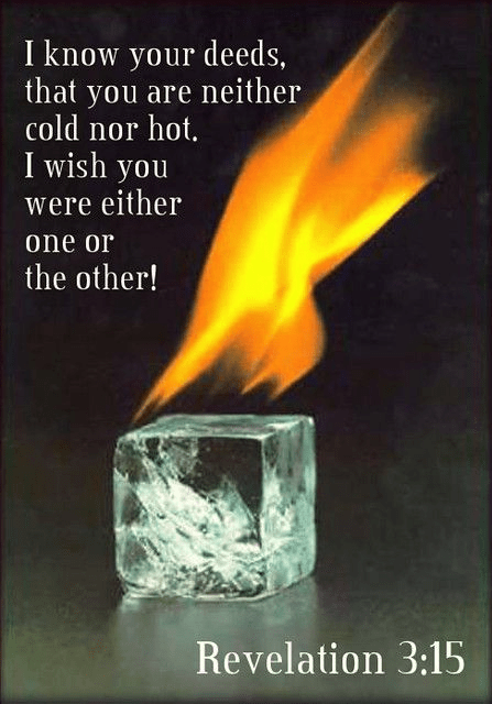 “‘I know your works: you are neither cold nor hot. Would that you were cold or hot! 16 So, because you are lukewarm, and neither cold nor hot, I will spew you out of my mouth. 17 For you say, I am rich, I have prospered, and I need nothing; not knowing that you are wretched, pitiable, poor, blind, and naked. 18 Therefore I counsel you to buy from me gold refined by fire, that you may be rich, and white garments to clothe you and to keep the shame of your nakedness from being seen, and salve to anoint your eyes, that you may see. 19 Those whom I love, I reprove and chasten; so be zealous and repent. 20 Behold, I stand at the door and knock; if any one hears my voice and opens the door, I will come in to him and eat with him, and he with me. 21 He who conquers, I will grant him to sit with me on my throne, as I myself conquered and sat down with my Father on his throne. 22 He who has an ear, let him hear what the Spirit says to the churches.’” (Revelation 3:15-22)